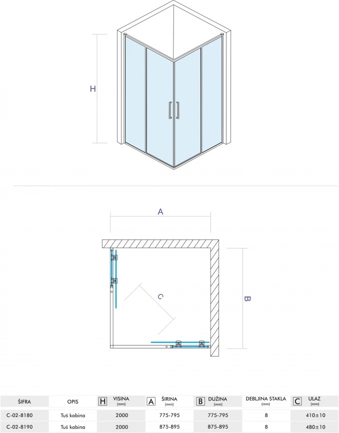 Tuš kabina CONCEPT STAR 90x90x200cm staklo 8mm providno C-02-8190