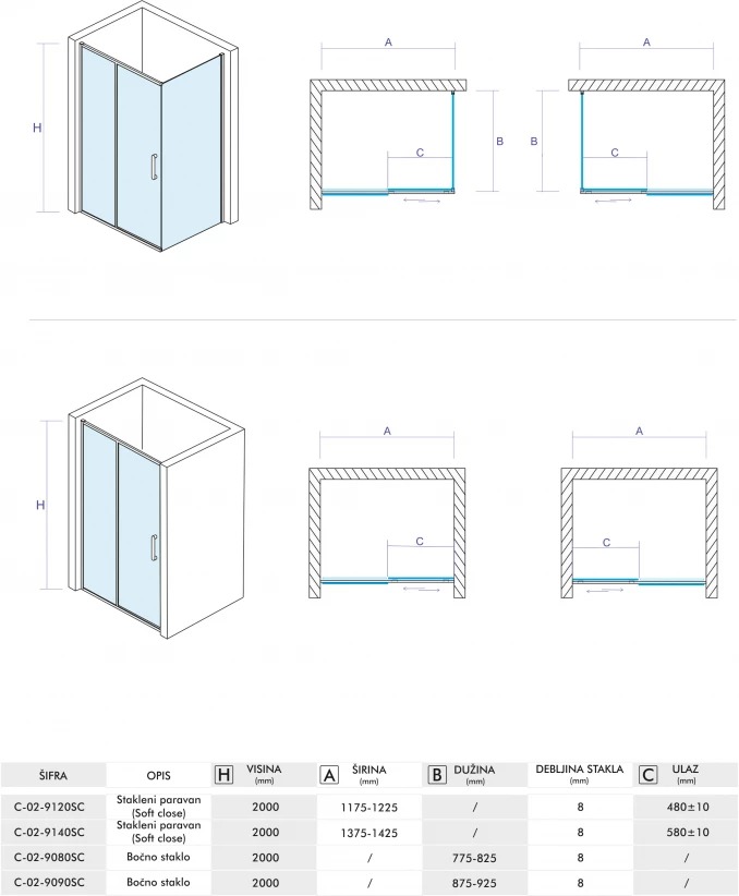 Stakleni paravan CONCEPT ALPHA 140x200cm 8mm staklo soft close C-02-9140SC
